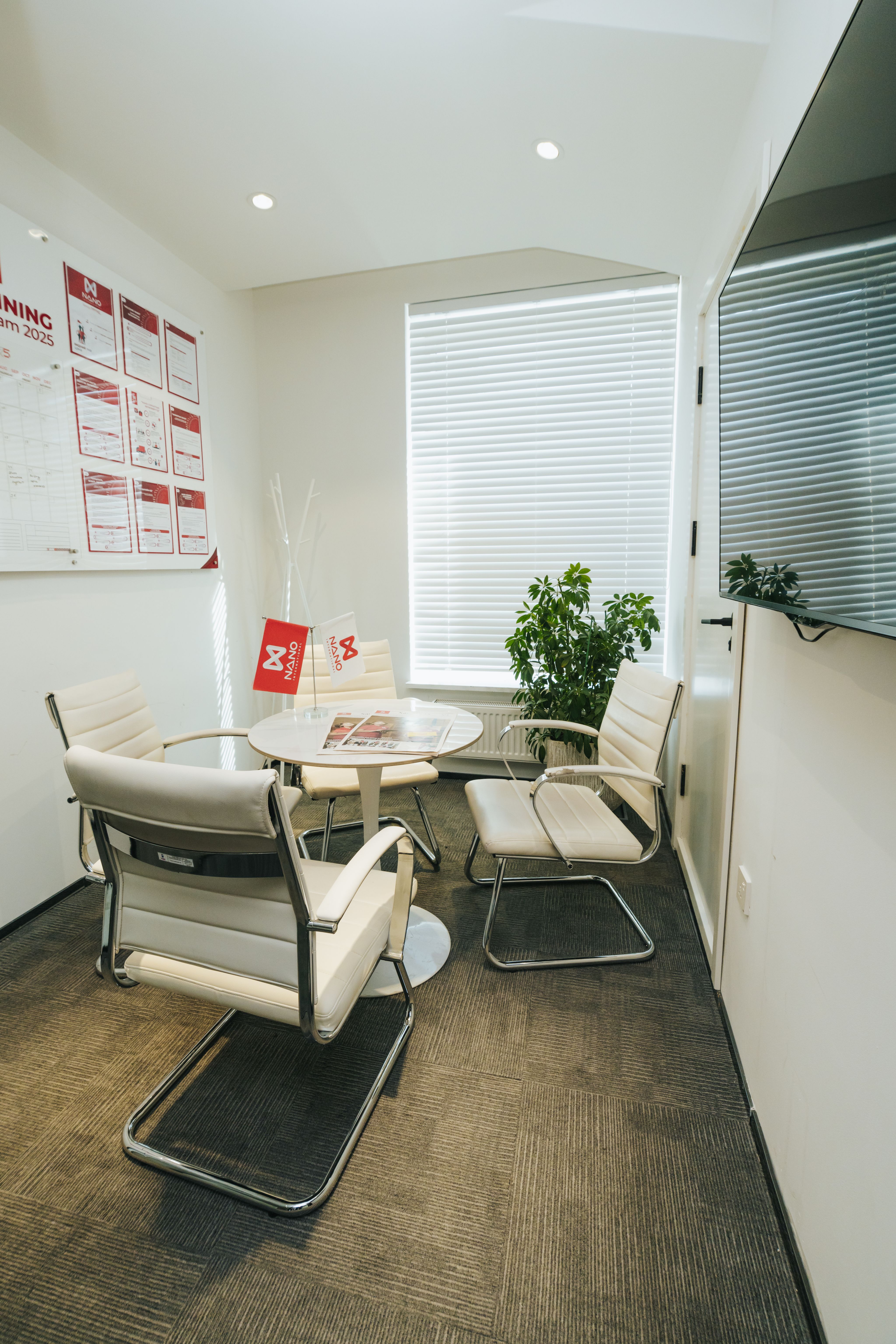 Нано Интернэйшнл-ийн бүх стратегийн уулзалт, хурал, хэлэлцүүлэг хурлын өрөө буюу цагаан өрөөнд болдог. Энэхүү өрөө нь цайвар өнгийн минимал интерьер, дуу тусгаарлагч хана, Logitech PTS Pro 2 төхөөрөмжөөр тоноглогдсон камер бүхий энэ өрөө нь гадаад түншүүдтэй видео уулзалт хийхэд өндөр чанарын дүрс, дуутайгаар хийх боломж олгодог.