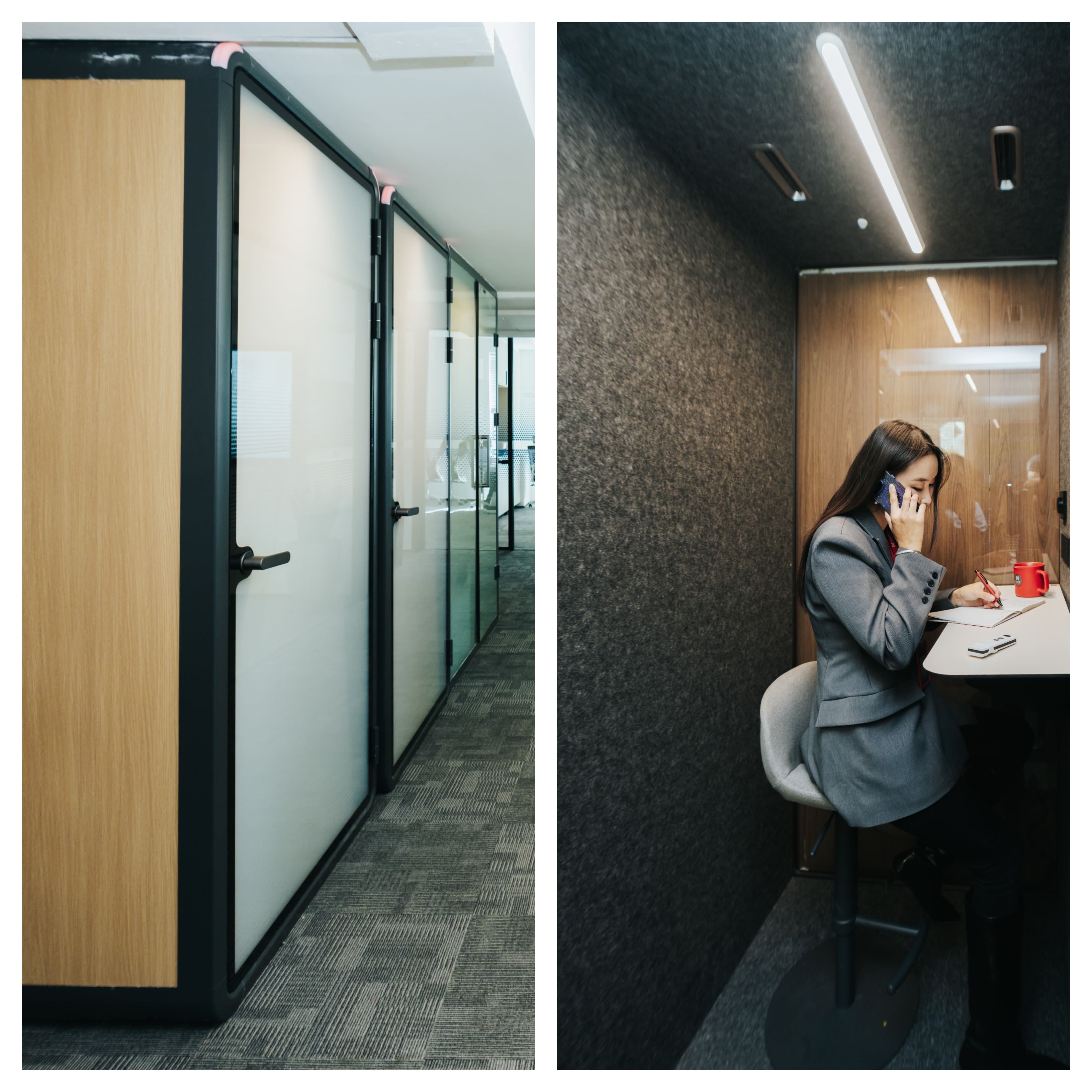 Технологийн дэвшилтэй хөл нийлүүлэн алхаж буй компанийн хувьд дуу чимээний менежмент бол бүтээмжийн нэг түлхүүр. Тиймээс Нано Интернэйшнл оффистоо Product Features брэндийн дуу тусгаарлагч “утасны бүхээг”-үүдийг суурилуулжээ. Эдгээр бүхээг нь 35 дБ хүртэл дуу чимээг бууруулж, хоёр минут тутам агаарыг бүрэн сэлгэдэг вентиляцийн системтэй. Мөн 4000K LED гэрэл нь нүд ядраахгүй, төвлөрлийг дэмждэг бөгөөд гэрлийн тохируулга нь хэрэглэгчийн хэрэгцээнд нийцдэг. Нэг хүний болон хоёр хүний зориулалттай бүхээгүүд нь утсаар ярих, онлайн уулзалт хийх, төвлөрөх шаардлагатай мөчүүдэд хамгийн тухтай орчин болдог. Цонх нь гаднаас харагдахгүй, мэдрэгчтэй шилээр хийгдсэн тул дотор орсон даруйд амьсгалаас өөр зүйл сонсогдохгүй.