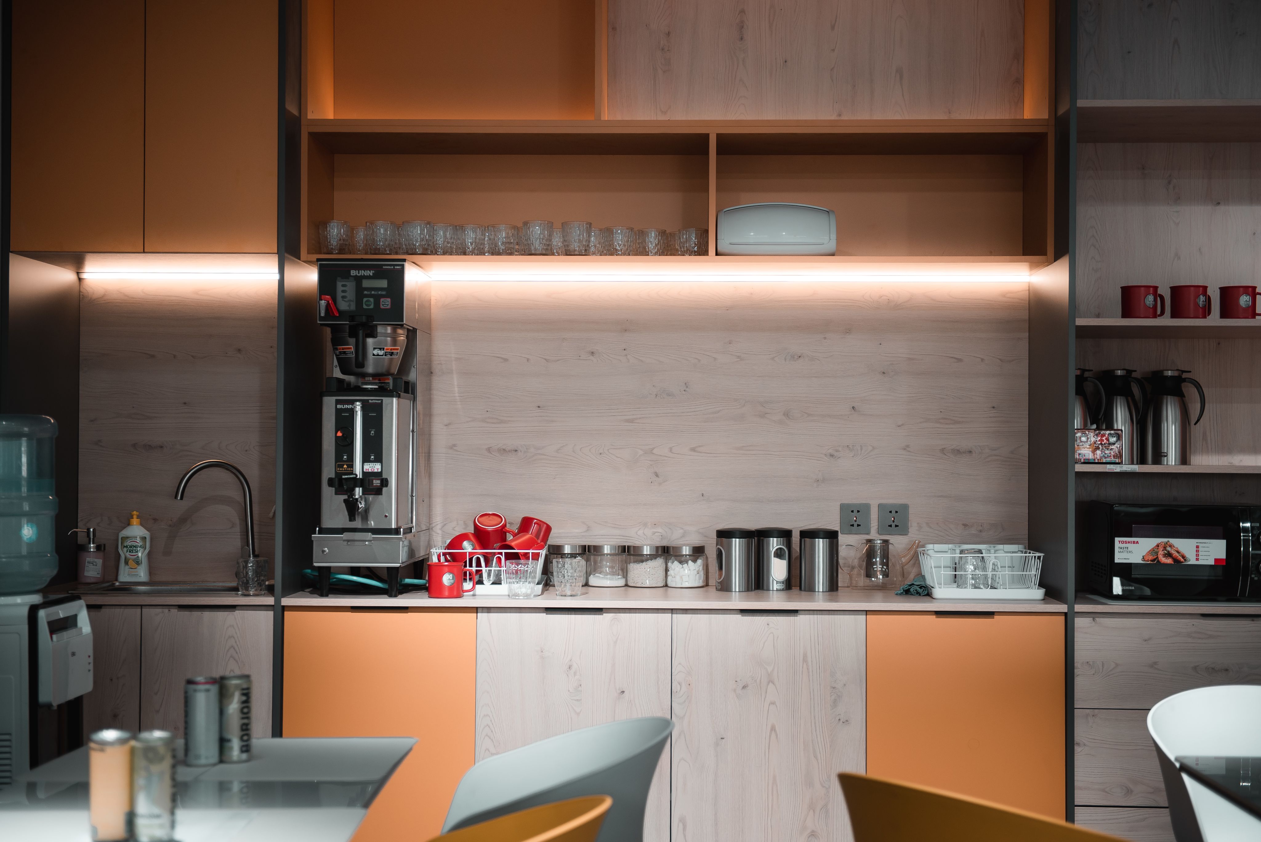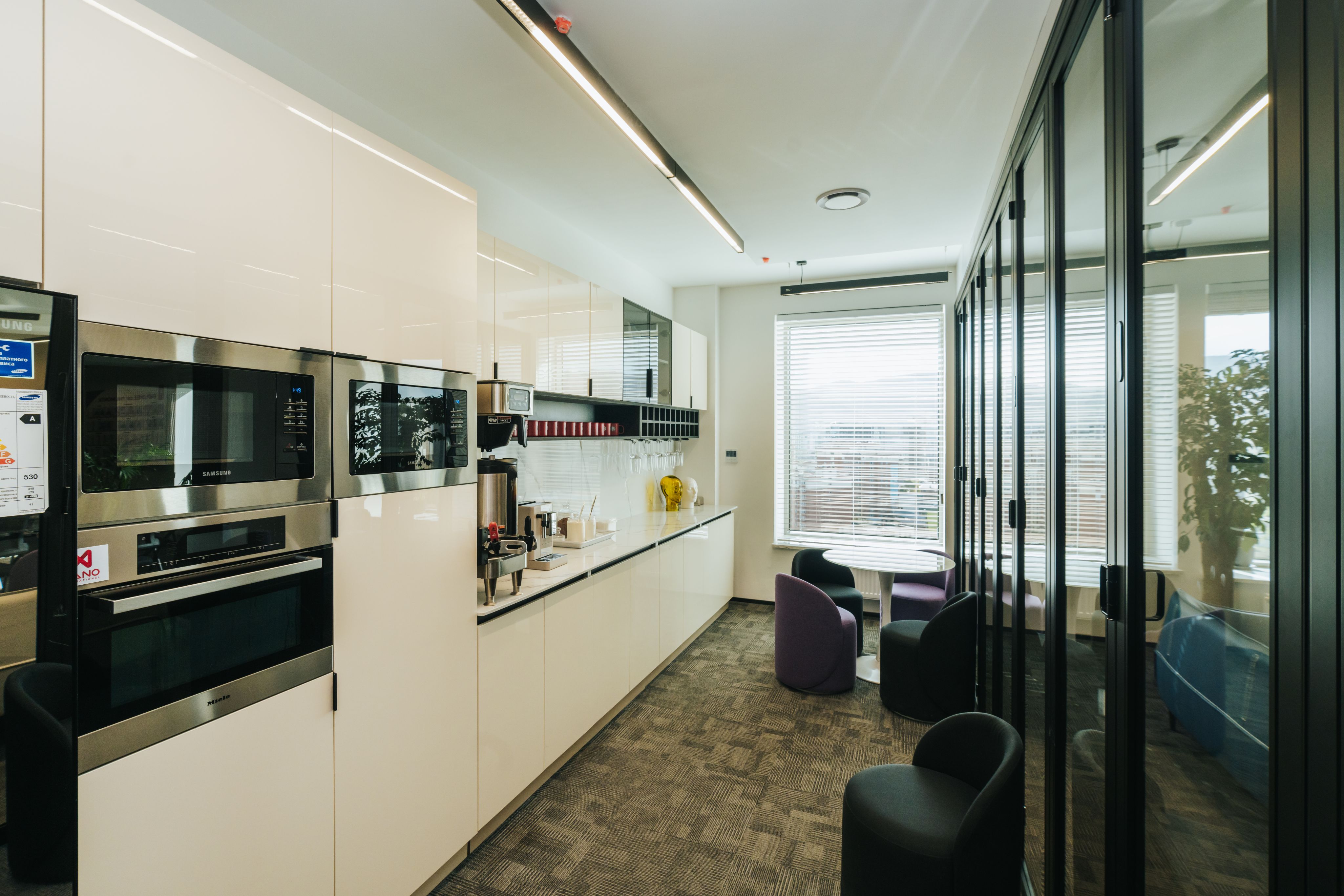 Энэ хэсэг сүүлийн үеийн кофены машин, аяга таваг угаагч, печь, хэрэгслээр бүрэн тоноглогджээ. Цэмцгэр, дулаан мэдрэмж төрүүлэх энэ хэсэг ажлын дундуур богино завсарлага авах, хамт олонтойгоо яриа өрнүүлэхэд төгс тохирдог. Энэ өрөөний нэг онцлог нь гал тогоо болон хурлын танхимыг тусгаарлах эвхэгддэг хана. Баасан гараг бүрийн Friday Night арга хэмжээний үеэр уг ханыг хураахад уудам хурлын танхимыг нийлүүлсэн илүү цэлгэр, илүү дотно уур амьсгалтай орчин бүрддэг.